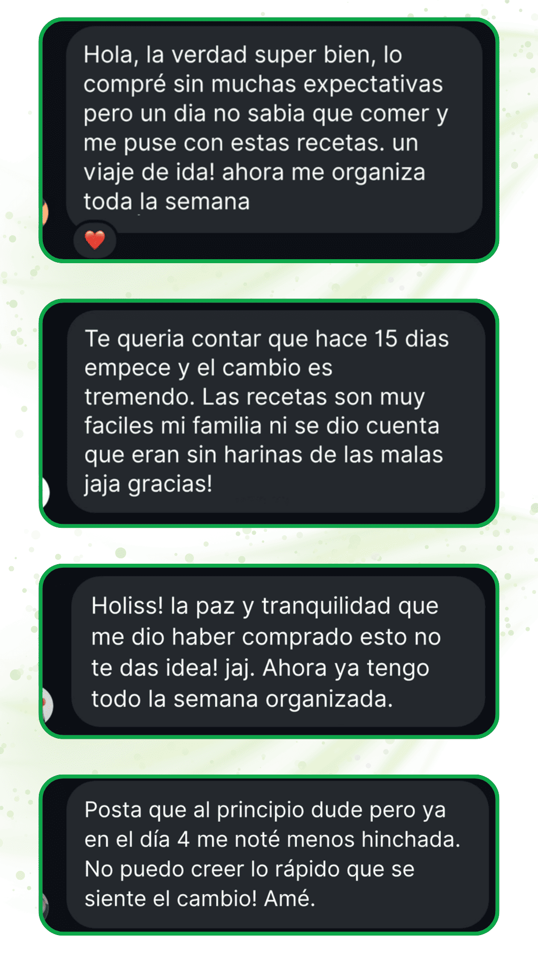 Por eso quiero que pruebes sin miedo: tenés 7 días completos para usarlo, aplicar las recetas y empezar a ver cambios. Si sentís que no conectás, que no te sirve o que no cumplió con tus expectativas, te devuelvo el 100% de tu dinero, sin preguntas ni vueltas.